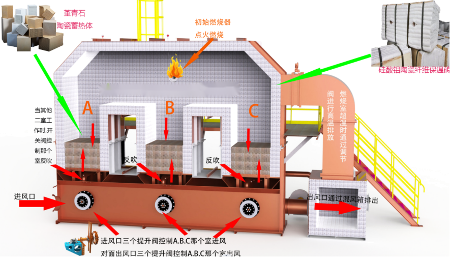 階段三:廢氣通過(guò)蓄熱床C被預(yù)熱,然后進(jìn)入燃燒室燃燒,蓄熱床B中殘留未處理廢氣被凈化后的氣體反吹回燃燒室進(jìn)行焚燒處理分解后廢氣經(jīng)過(guò)蓄熱床A排出,同時(shí)蓄熱床A被加熱。